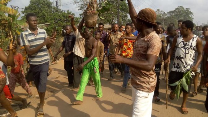 Fetish items were discovered in the suspect’s room as the angry villagers forced him out and paraded him round town including the market square with the items.
