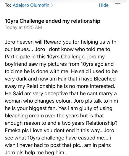 Relationship adviser, Joro Olumofin has shared the story of a lady who crashed her relationship after participating in the social media craze called #10YearsChallenge which involves merging an old picture with a recent one to indicate progress in life.