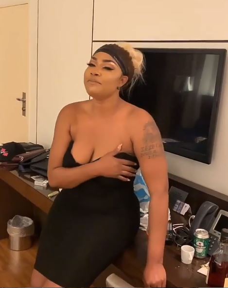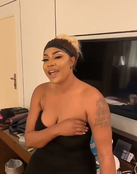 Mother of one, Angela Okorie had to support her black gown with her hand as the skimpy cloth tried to expose her bosom.
