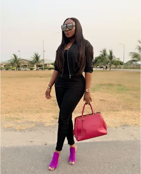 She stuns all black coupled with a pair of purple shoes and a pink designer bag.